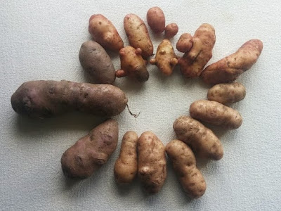 The others are all offspring of Pink Fir Apple. I wonder about that dark mauve skinned one; it looks like the other parent could be Purple Viking, which is known for producing some real lunkers. But maybe not; who knows what genetics are lurking beneath the surface in potatoes? The one at the top retains a hint of the waxiness of Pink Fir Apple, but the other two are quite light and fluffy in texture. They are all reasonably productive. These are the last remaining few selected from quite a few seed-grown potatoes. We discarded one I was quite interested in. It only grew about 6 or 8 inches high. It also produced about 6 very small potatoes per plant too, and that just wasn't going to cut it, unfortunately. Still! I'm pleased with the ones that remain.