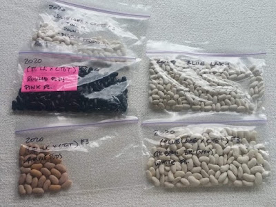 I've sorted the crosses into 4 groups: the one I wanted the most was a pink-flowered, white-seeded, round (in cross-section) bean - there was exactly ONE. I have saved the seeds from that plant, up at the top right. Below it are the best from the much more common pink-flowered, black seeded, round bean. The beige seeds produce plants with purple pods; that's been the case since the cross first happened. I'd be more excited about them, because they are productive, tasty, and disease resistant, but for the fact that there are already quite a few purple-podded pole beans out there, and I don't know that mine are any improvement on them. Finally there are a lot of white-flowered, white-seeded plants and I saved seeds from the best of them. The seeds tend to be larger than those of the original Blue Lake, and the pods even more variable from round to really quite flat. There's also a lot of variability on the anthracnose resistance front, so we will be continuing to winnow out the disease-prone ones for a few years, I expect. But over all, they really are looking quite good.