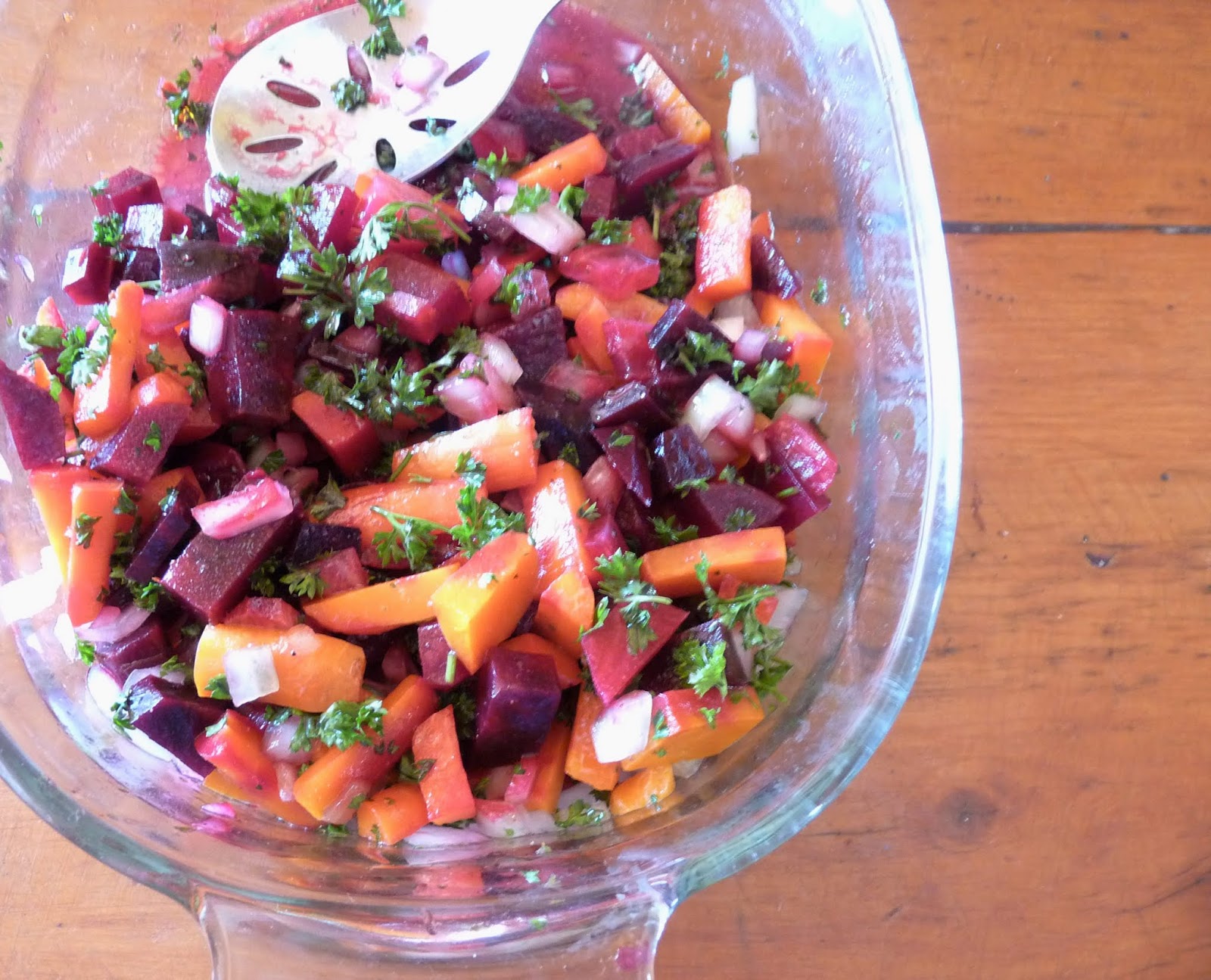 There is also a lot of "waste" from these, because you will have the trimmings from the stacks themselves, as well as bits of the apple and beets which were not suitable for cutting into 2" or larger rings. Don't throw that away! Chop it all up a bit and toss it together with any leftover cheese and marinade; put it back in the fridge and serve it in little scoops on mixed greens tomorrow as a more informal salad. Of course, if you can't be bothered with cutting your salad into fancy stacks at all, you could do that with the whole lot in the first place.