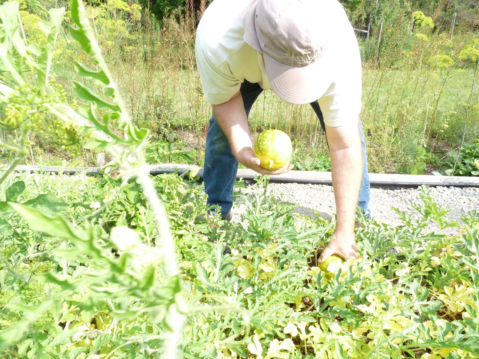 September 20th is a rather late date for watermelon, at least from the point of view of wanting to eat them. Ideally, ripe watermelon would appear from mid-August until the end of September, and here is our first watermelon perilously close to that end date. This is certainly one of the problems with growing watermelon in this climate. We get a lot of ripe watermelons right through October, but it is not necessarily when one would like to have them.