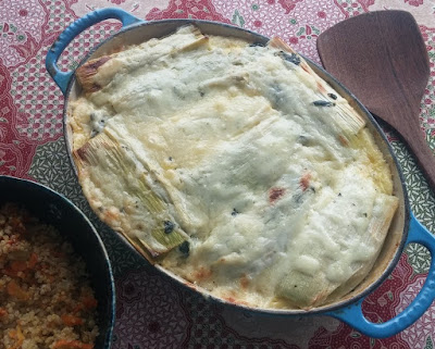I go into some detail about how to prepare the leeks, but once you have it down, making stuffed leeks is about the same level of difficulty as making a lasagne, and the dishes take a similar amount of time to do. You could do this into the winter with frozen spinach, which would have to be thawed in advance but would probably cut almost 15 minutes from the prep time.