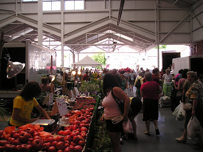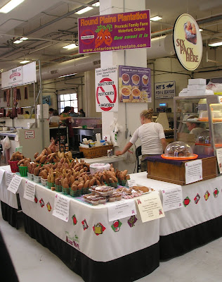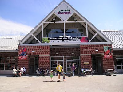 This week, we got up and headed off to the Kitchener Market for our Saturday morning outing and food-stocking-up adventure. It's housed in a modern building that for the most part works fairly well, although it has a few odd quirks to it. There is a large square outside the front, which always seems a bit underpopulated. There's a radio station on one side of it and they always seem to be blasting out bad music, so we scurry in as quick as we can.