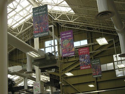 The high barn-like ceiling is adorned with multi-lingual welcome banners, reflecting the increasing diversity of the Kitchener-Waterloo area.