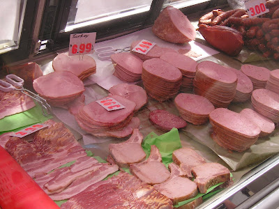 Kitchener's Germanic heritage means that there are still a lot of independant butchers producing high quality meats. Here is a typical sampling - sausages, cold cuts, bacon and a local specialty, smoked pork chops. Pork is king, but there's also lots of beef and poultry. I've even seen rabbit.