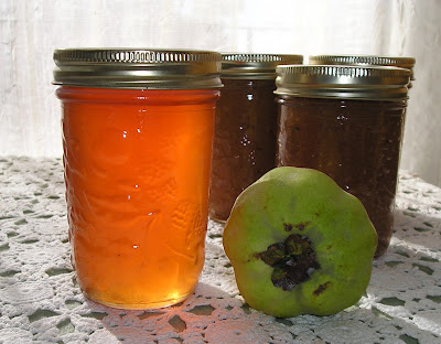 My jelly turned out very well, I thought. The paste is a bit coarse in texture, which doesn't bother me particularly. If it did, I might peel and core the quinces instead of just chopping them, and wrap the cores and peels in cheesecloth to be boiled along with the rest of the fruit then discarded. The strained quinces could then be put through the food processor for a smoother texture. I doubt I'll bother though; I don't find the rustic texture I achieved unappealing.