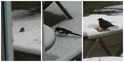 Beautiful pictures of the snow, running water, ice, hare's footprints, and Robin, Magpie and Mrs Blackbird!