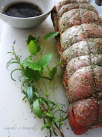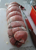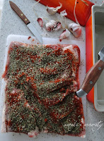 postępować identycznie. Kawałek mięsa szynkowego, nie nadziewamy ziołami, tylko smarujemy mięso z dookoła i szpikujemy ząbkami czosnku.