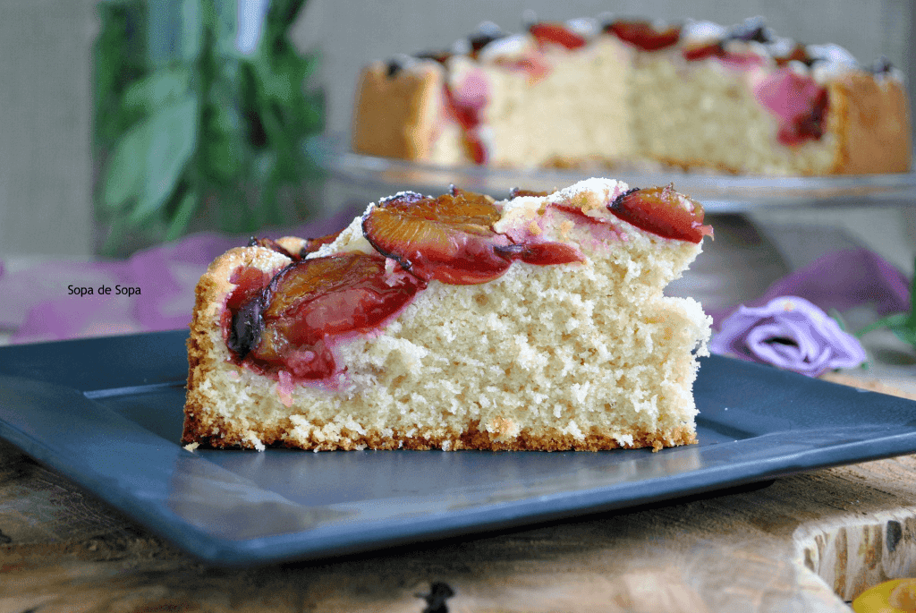 Este pastel es más bien un bizcocho, que al colocarle los gajos de ciruela encima le da jugosidad y humedad.