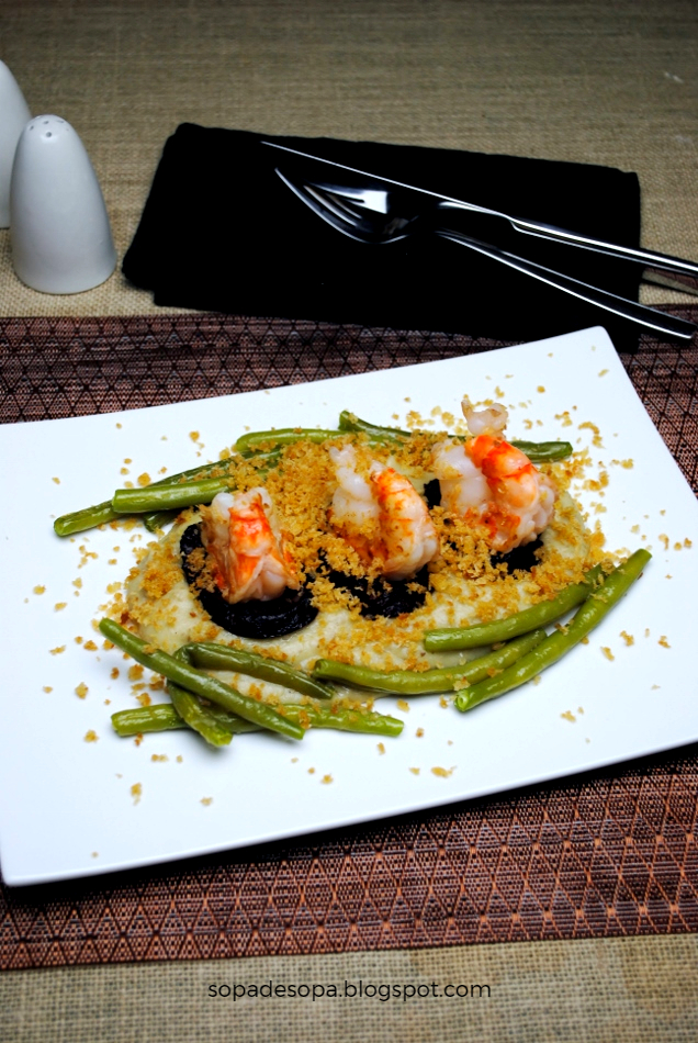 éstas los gambones. Repartir unas cuantas de judías por el alrededor y terminar