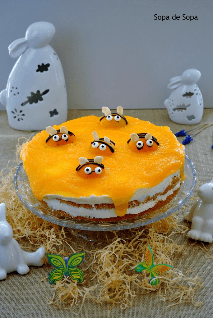 Y como no todo va a ser tristeza os traigo una tarta de albaricoques, queso Quark y Mascarpone, muy divertida, ya que con las mitades de los albaricoques haremos las "abejas comestibles". Así que es apta para niños y adultos. Es fresca y poco dulce.