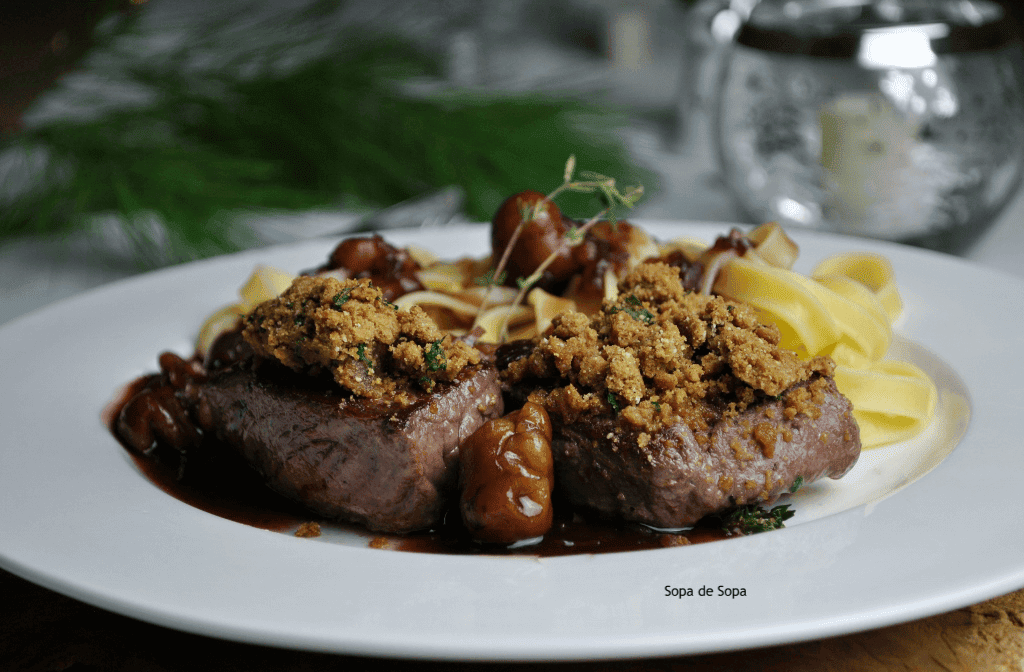 una porción de estofado de carne en los platos y repartir las setas por encima. Decorar con una