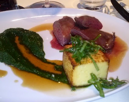 Paloma con salsa de trufa, espinacas y galleta de patata.
