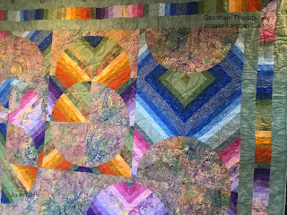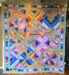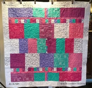 Here's a couple of quilts from Jo. The first a variety of circles in colors to represent all of the colors you will see when looking into the Northern Lights. Jo, who has had the opportunity to witness the beauty of the Northern Lights with her husband made this quilt in his memory. This amazing quilt is a true work of art, I can see the full moon and it's transformation into it's different phases. Jo selected a whimsical star design for the quilting finishing it off magnificently. Her second quilt is a cute little quilt in fun colors and lots of fun prints.