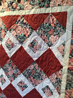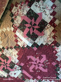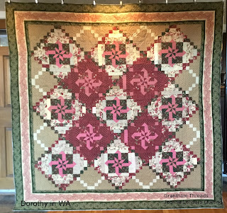 Here's another marvelous quilt from Dorothy in WA. The pinks, greens and reds of this kit blend together beautifully for a remarkable finished quilt. Using a larger quilting design for the stitching was an excellent choice. Dorothy in efforts to keep her leftovers under control also made a couple of table toppers. Good job Dorothy!