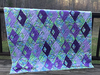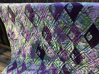 All worked up in shades of purples and greens is this cool modern quilt from Dianne. The overall design and colors remind me of those mod fabrics from the 60's. Just proving all that is old is new again!