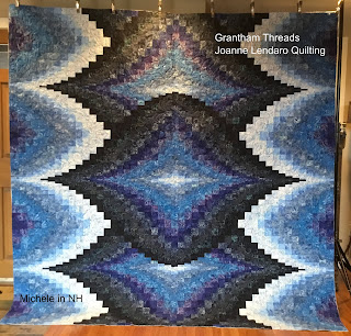 WOW! WOW! WOW! I just love this next quilt from Michele!! An incredible bargello in shades of blues, grays and black with a hint of purple to bring it all together. Michele's second quilt is a stack-n-whack that creates a amazing array of interesting blocks from the original fabric.