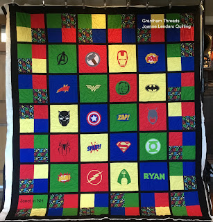 Janet probably got the "Grammy of the year" award from her grandson Ryan! How super amazing is this quilt she made for him? Janet machine appliqued all of the super hero emblems along with Ryan's name on his quilt. Adding minky as the backing and a light batting resulted in the most perfect Christmas present ever for her little guy! Great job, Janet!!