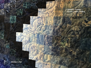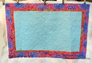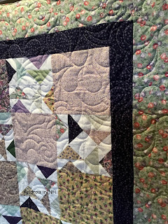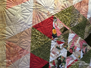 Cheona did an excellent job on this great wall hanging! The fading of the tans mixing with the lighter inner bordering fabrics was spot on! Also notice the way she used the scrappy crazy quilting on the center of the piece, it was a superb way to bring all of the colors together! Can't move on without commenting on the quilting design, it matched perfectly!