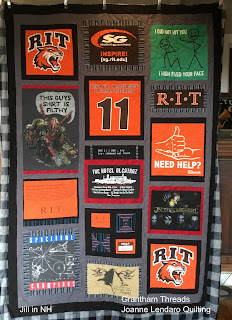 Last quilt of the month is this t-shirt quilt from Jill in NH. Lots of fun shirts and bright colors in this one. Finished off with a ultra modern quilting design and the fuzzy fleece backing was spot on for this one!
