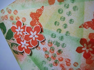 A panel of gray card was adhered to a white card base. The sphere was die cut from white card and using second generation stamping, the leaves were added. The shape was cut a second time from yellow cardstock and the frame was inlaid onto the white circle. It was adhered with foam to lift it from the card base ............ The butterfly was punched from DSP, the edges sponged and popped up with foam. The tendrils were thin strips cut from the same DSP and wound tightly before being adhered under the round image.The sentiment was stamped with a tiny leafy flourish. Pearls were added to two corners and one was applied to the butterfly. The inside of the card was decorated down the right edge with a thin strip of the same DSP.