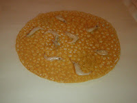 - Primera versión de la tortilla de camarones, impresionante, como una especie de algodón salado, con camarones super crujientes y un polvito picante por encima. La segunda versión de la tortilla de camarones. Una especie de galleta con los camarones crudos encima. Completamente diferentes una de la otra.