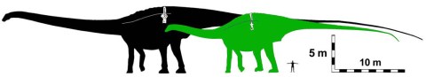Carpenter 2018: Figure 7. Body comparisons of Maraapunisaurus as a 30.3-m-long rebbachisaurid (green) compared with previous version as a 58-m-long diplodocid (black). Lines within the silhouettes approximate the distal end of the diapophyses (i.e., top of the ribcage). Rebbachisaurid version based on Limaysaurus by Paul (2016), with outline of dorsal based on Rebbachisaurus; diplodocid version modified from Carpenter (2006).