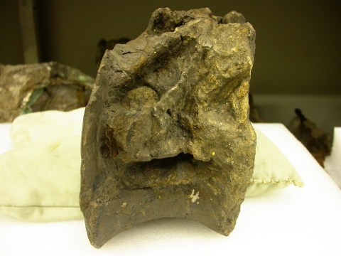 Here’s the same thing annotated (yeah, it does look a little like an Ent who is alarmed because his left eye has been overgrown by a huge nasal tumor). This vert has two sets of pneumatic features on the centrum: a big lateral fossa below the sacral rib articulation, presumably homologous with the same feature in S4 of the Diplodocus above; and a smaller dorsolateral fossa above and behind sacral rib articulation.