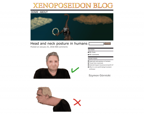 A while back — near the start of the year, in fact — Szymon Górnicki interviewed me by email about palaeontology, alternative career paths, open access, palaeoart, PeerJ, scholarly infrastructure, the wonder of blogging, and how to get started learning about palaeo. He also illustrated it with this caricature of me, nicely illustrating our 2009 paper on neck posture.