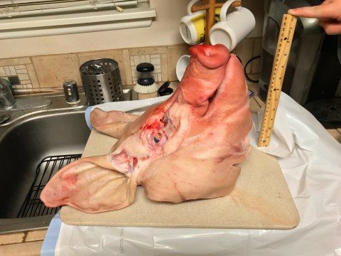 What was I doing here? Getting off the ears, and as much skin and subcutaneous fat as possible, in preparation for brining and smoking. I like this photo, the little piggy looks positively happy about having its skull prepped.