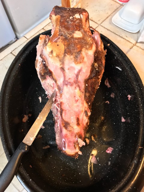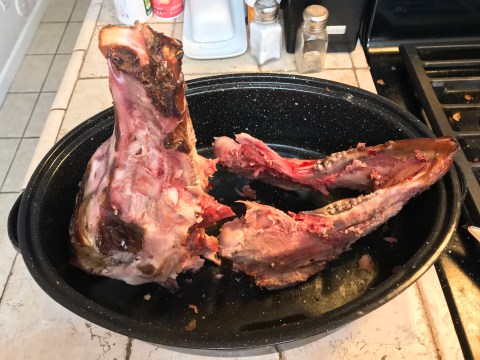 Defleshing, both to get the edible meat off, and to get as much of the rest of the soft tissue off in preparation for simmering. In this anterior view, you can see that the right side of the animal’s forehead (viewer’s upper left) got exposed during the smoking process and the bone is stained brown.