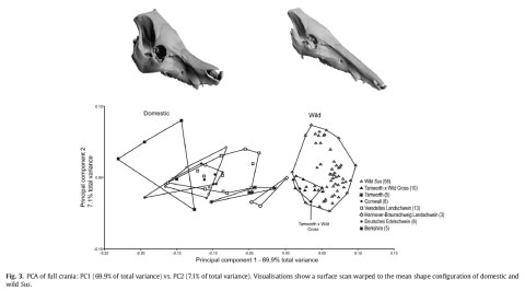 This figure from Owen et al. (2014) sums up the shape differences between domestic (left) and wild (right) Sus scrofa.
