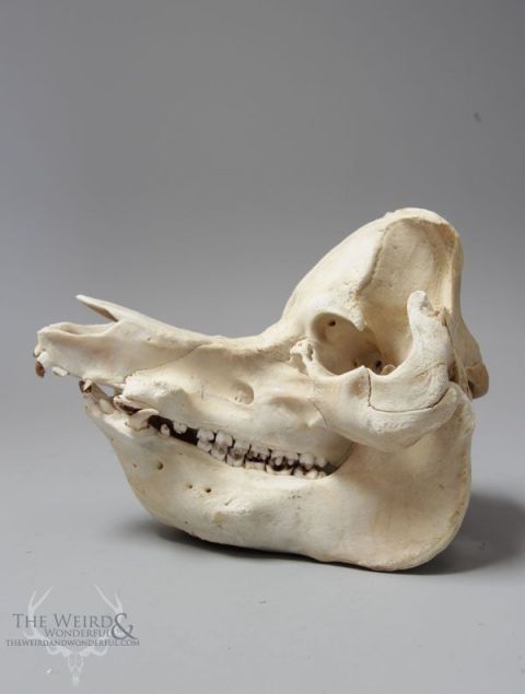 Here’s a skull of a wild boar. Note the loooong face, practically a straight line from the tip of the snout to the top of the back of the head.