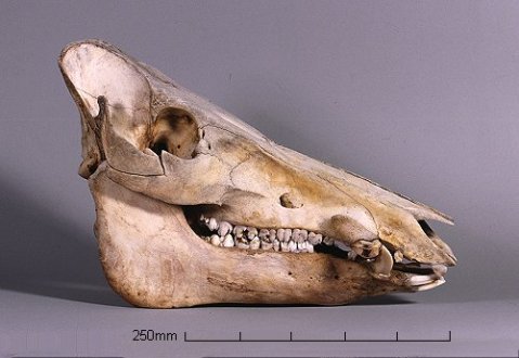 Oddly enough, the high forehead in domestic pigs is not always associated with a super-short snout, as this skull demonstrates.
