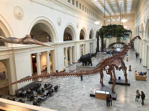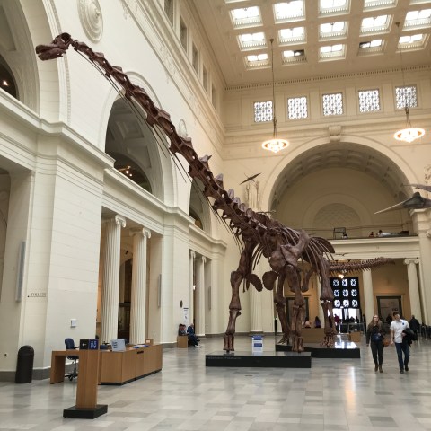 Finally, since we’ve had a bit of a sauropod drought lately, here are a couple of photos of the mounted cast skeleton of Patagotitan in Stanley Field Hall at the Field Museum of Natural History in Chicago.
