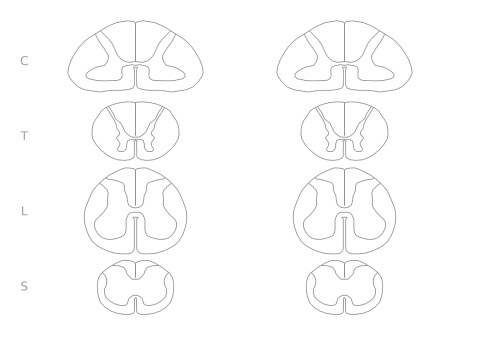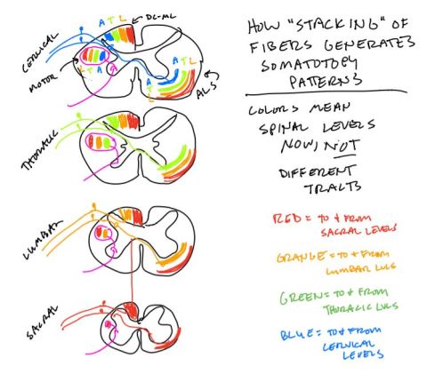 This one shows cross-sections of the cord at cervical, thoracic, lumbar, and sacral levels, for drawing ascending and descending pathways and thinking about how patterns of somatotopy come to exist.