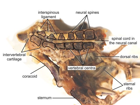 Finally, there are the transverse spaces for the lumbosacral balance organ, which I discussed in this post. Those are the things that look like caterpillar legs sticking up from the sacral endocasts in the above figure from Necker (2006). In life, the spaces are occupied by loops of meningeal membranes, through which cerebrospinal fluid can slosh around, which in turn puts pressure on mechanoreceptive cells at the edge of the spinal cord and gives birds a balance organ in addition to the ones in their heads. In the photo of the cooked chicken, the delicate meninges have mostly fallen apart, leaving behind the empty spaces that they once occupied.