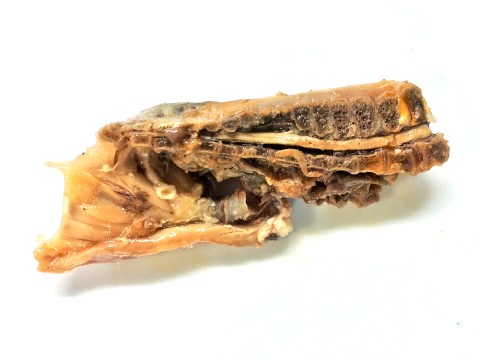 I don’t know how universally true this is, but IME in the US when you buy a quartered chicken, the vertebrae are usually nicely hemisected by the band saw that separated the left and right halves of the animals. So you can see the neural canal in both the dorsal and sacral parts of the vertebral column. Here are the hemisected dorsal vertebrae in the breast quarter from a sectioned rotisserie chicken: