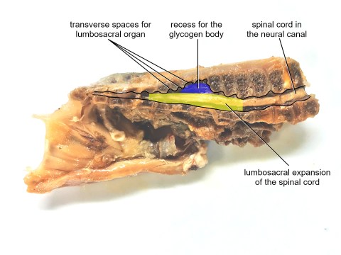 And, hey, there are three of our alternative hypotheses on display: the long (many vertebral segments) lumbosacral expansion of the spinal cord, which is reflected in a gradually expanded neural canal in the synsacrum; the shorter, higher dome-shaped recess for the glycogen body; and finally the transverse spaces for the lumbosacral balance organ.