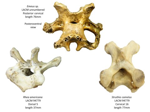 At the time I read that review, I already had images illustrating five of the six hypotheses. A juvenile ostrich synsacrum that Jessie Atterholt and I had CT scanned gave us three of them all by itself: the lumbosacral expansion of the spinal cord to run the hindlimbs, as in all limbed tetrapods and in some fish with sensitive fins; the transverse channels in the dorsal wall of the neural canal to accommodate the lumbosacral balance organ; and the paired troughs in the floor of the neural canal that house the ventral eminences of the spinal cord (Figure 4D in the image at the top of this post). I had good photos of pneumatic foramina in the walls and floor of the neural canal in a dorsal vertebra of a rhea from my 2014 SVPCA talk (Figure 4B), and some photos of small foramina, presumably for blood vessels rather than air spaces, in the floor of the neural canal in a caudal vertebra of Apatosaurus (Figure 4A).