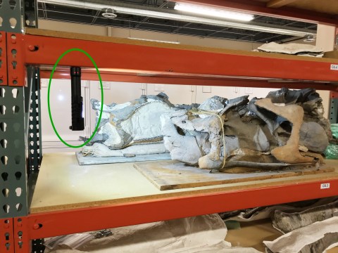 Magnetic flashlight hanging from steel shelving to illuminate Camarasaurus cervical vertebrae in the Utah Field House collections.