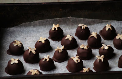 Jednostavan recept za suhe šljive umočne u čokoladu je iz bilježnice moje mame i jako dobro objašnjava ovu filozofiju. Kad god pripremim ovaj “evergreen” plane u minuti, a rijetko tko uspije prepoznati što se doista krije ispod krhkog čokoladnog omotača. Meka unutrašnjost ovog bombona nalikuje više nekom ukusnom želeu, nego šljivi i mogli biste se iznenaditi koliko su bomboni ukusni. Mi smo ih uglavnom pravili kao jedne u nizu božićnih kolačića, recept je navodno mađarski ili je barem takvu informaciju zajedno s receptom dobila moja mama. Ovaj put sam ih pripremila s kardamomom – kako sam se već više puta uvjerila, suhe šljive i kardamom su divna kombinacija. Premda ih pripremam tako da ih slažem na voštani papir, u originalnom receptu, suhe šljive na čačkalicama se zataknu u jabuku, koja služi kao stalak dok se čokolada potpuno ne stvrdne. Ovaj zgodan postupak omogućit će vam da bez puno iskustva i muke dobijete besprijekorne bombone.