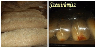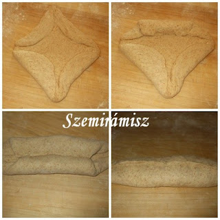 Majd kinyújtottam nagyjából négyzet formájúra, és a fenti képen látható módon, Limara tanácsát követve , megformáztam.Szorosan feltekertem, egy nagyméretű sütőzacskóba tettem, majd ment a végleges helyére, a széthúzható sütőformába.