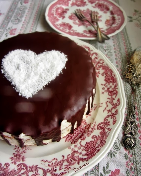 Ez a torta Valentin napra készült, csak sajnos már nem volt időm akkor posztolni... Ami nem csoda, mert előző este 10 órakor álltam neki sütni. :)) Ebből két dolog is kikövetkeztethető: egyrészt az, hogy mindig mindent az utolsó utáni pillanatra hagyok.. :)), másrészt az, hogy nagyon gyorsan elkészíthető. Nálam ez sütiknél fontos szempont, képtelen vagyok egy desszert miatt egész nap a konyhában állni..
