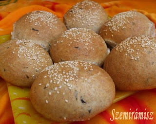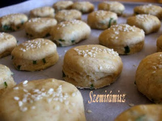 A pogácsák tetejét megkentem a felvert tojással, megszórtam szezámmaggal, majd kb. 25 perc alatt készre sütöttem.
