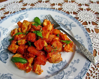 A batátát szintén kockára vágtam, és kókuszzsíron pirosra sütöttem, majd a paradicsomos csibemellhez szedtem, és összekevertem.