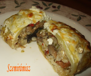 Majd hozzáadjuk a kis kockákra vágott paprikát, ezzel is átpirítjuk, végül jöhet bele mindkét fajta gomba. Sózzuk, borsozzuk, csipetnyi kakukkfűvel ízesítjük. Felönthetjük egy kevés vízzel, vagy a káposzta főzőlevével, elég 1 dcl. Kb.15- 20 perc alatt elkészül a gomba, ekkor adjuk hozzá az apróra vágott petrezselyemzöldet. Végül jöhet bele a barnarizs, az egészet jól keverjük össze.
