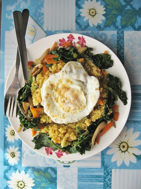 So how about pairing the kale and mushrooms with spiced quinoa, topped with a fried egg?