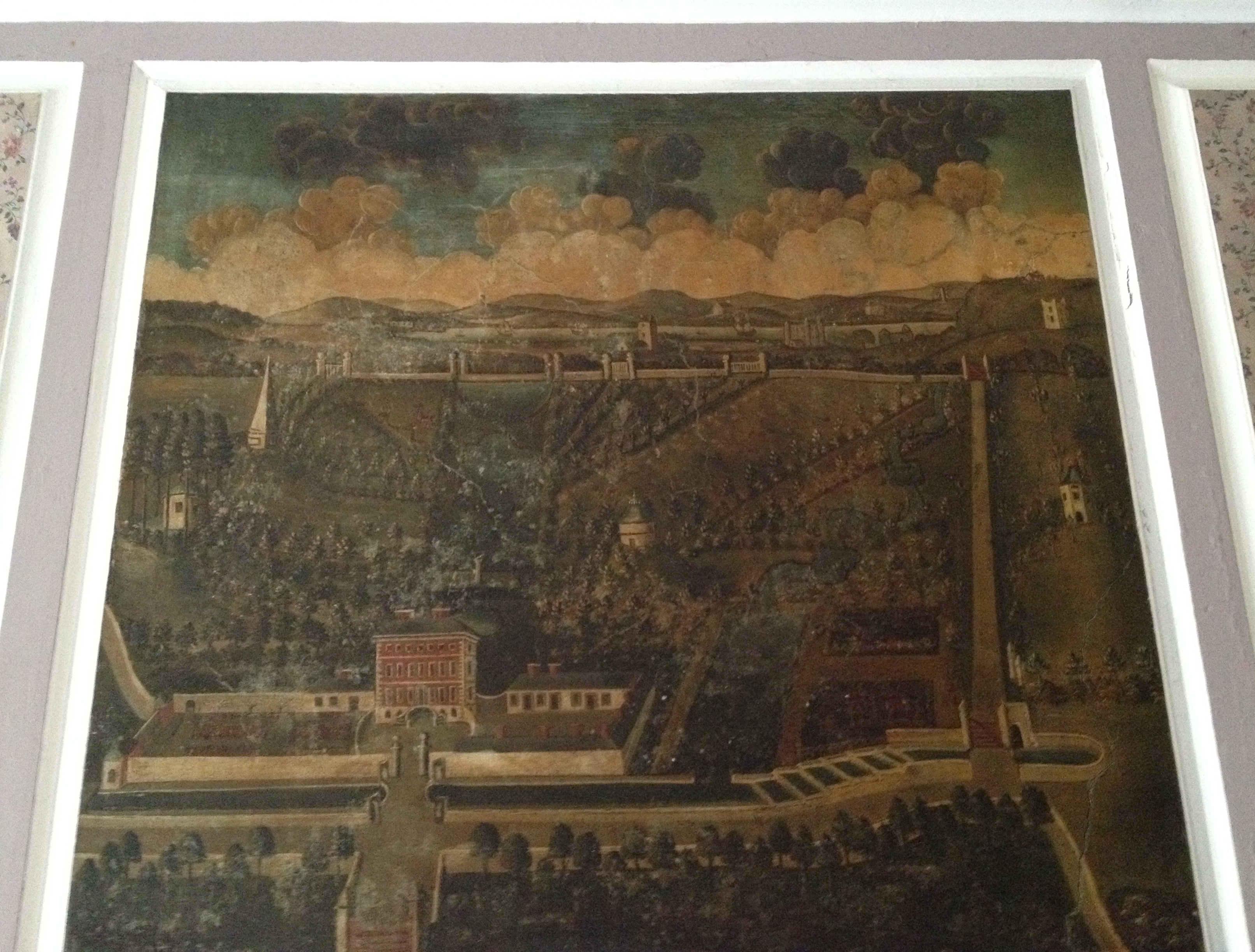 A mural above the drawing room chimney piece of Mount Ievers Court, County Clare showing the house and its surrounding parkland. Mount Ievers was built between 1733 and 1737 for Henry Ievers to the design of John Rothery who seems to have been a local architect and who died before the building’s completion. Depicting the north facade of the house, the mural is usually considered to have been painted not long after work finished and to be an accurate record of Mount Ievers. Yet a quick look at images of the building then and now shows one crucial difference. In the picture, the entrance is shown as accessed via a horseshoe staircase, whereas today, as can be seen below, a double-flight of stone steps runs directly up to the door. So did the painting show what was intended but not executed, or what was constructed but subsequently altered?