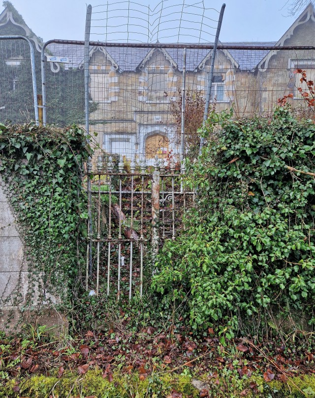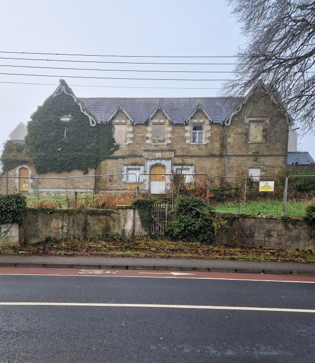 Boarded up and falling into dereliction: the former administration block of the workhouse in Mullingar, County Westmeath. Many of the other buildings that were part of this complex have since been given fresh purpose by the Health Service Executive (albeit with the introduction of uPVC windows: when will official Ireland ever provide a lead here?). However, this handsome house, which is at the entrance to the site, is in a wastefully poor state, only saved from total ruin by being constructed in sturdy limestone. Dating from 1841 and built in the Tudor-Gothic style to the design of architect George Wilkinson, the building’s present state is a shameful waste of state resources.