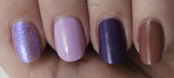 Of course I had to try layering Yesterday Tomorrow and Fantasy. I left three coats of it by itself on my index finger then did various creme bases on the other digits: LA Colors Color Craze Gel Jazzy (light orchid), Sally Hansen Insta Dri Vivid Violet (purple), and Color Club Take It All Off (warm brown).